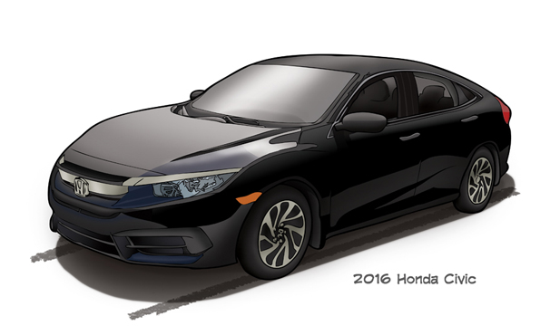 This is the place to get a CUSTOM illustration of your FAVORITE car. Most folks think fondly of their FIRST car... but Rocky can draw ANY car you desire! [Like this 2016 Honda Civic beautifully black!] |